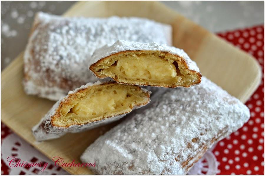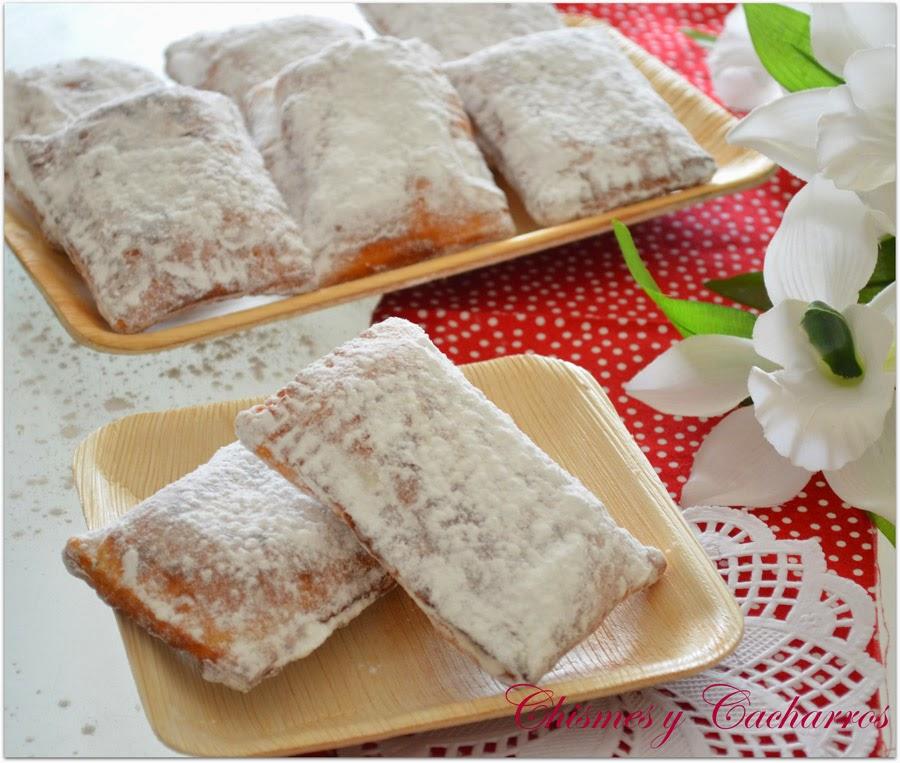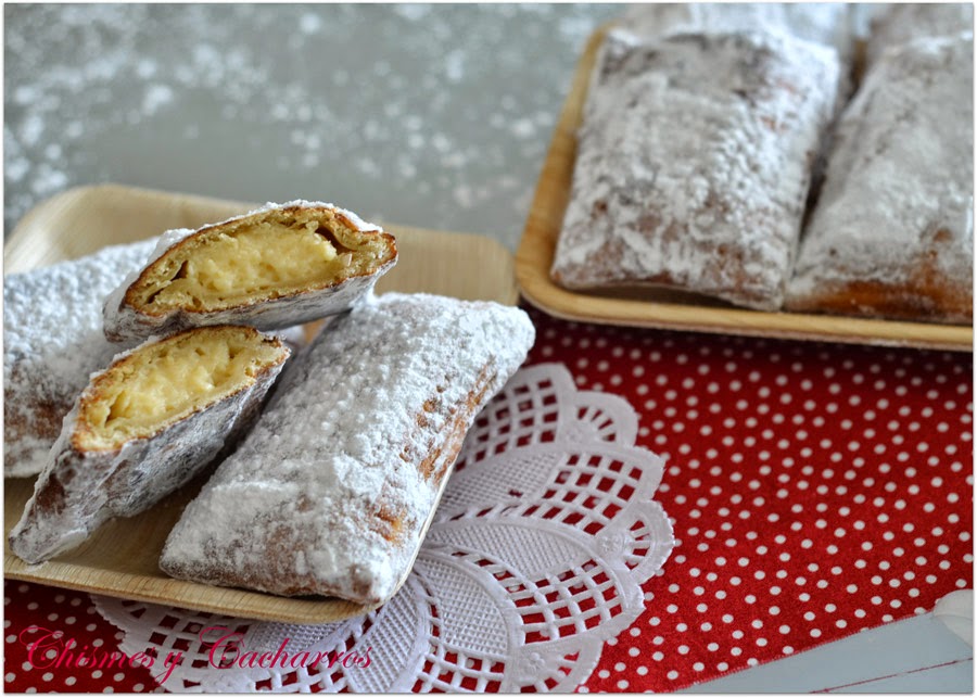 Pasadas las 2 horas, estirar la masa con un rodillo, se maneja muy bien esta masa, hasta conseguir un rectángulo de medio centímetro de grosor. Se cortan tirar anchas y largas como la foto, se rellena con la crema pastelera y se cierra. Untar los bordes con un poco de agua y luego marcar con un tenedor como si fueran empanadillas (marcar por los dos lados para que quede bien sellado). Freír en abundante aceite de oliva, por los dos lados hasta que estén dorados. Sacar a un plato con papel de cocina, después rebozar en el azúcar.
