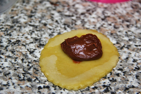 Cortamos con la forma deseada, colocamos una cucharada de crema y cerremos como si de una empanadilla se tratase.