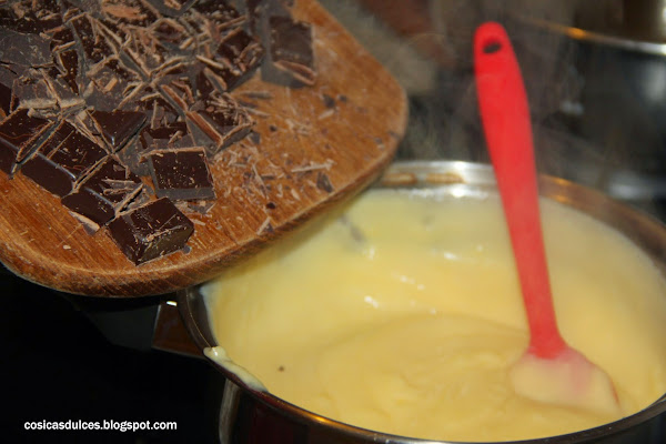 Cuando la crema haya espesado le añadimos la mantequilla y el chocolate. Removemos para que todo se integre bien y reservamos.