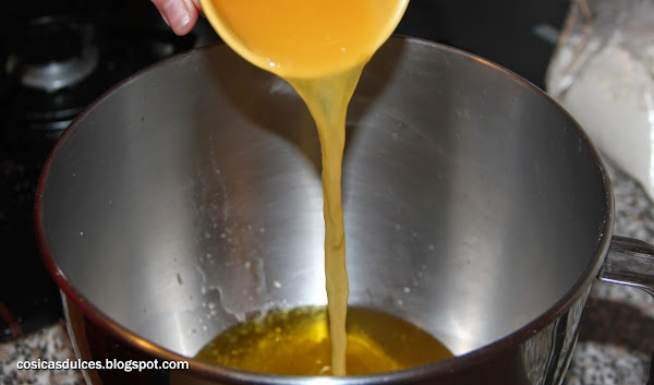Mientras la crema se enfría preparamos la masa. Templamos el aceite y lo vertemos en un bol. Sobre él añadimos el zumo de naranja (o el agua en la receta original) y el azúcar.