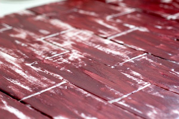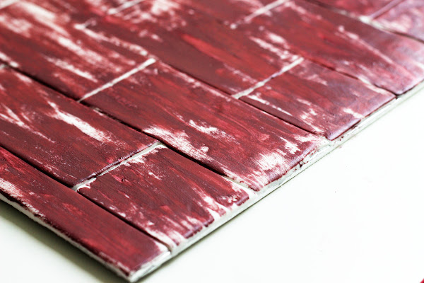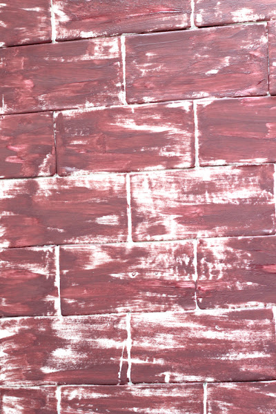 Una vez pasado ese tiempo, pondremos en un bol un poco de la pintura en gel marrón ( si es muy espesa poner unas gotas (2-3) de licor blanco para que sea un poco más líquido) Y con la brocha un poco gordita iremos dando pequeñas bronchadas (jejejeje si si brochadas) a los ladrillos sin reparar en si quedan todos cubiertos de pintura o no.