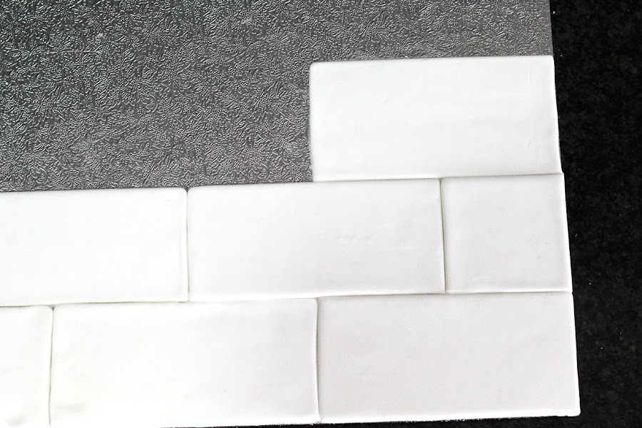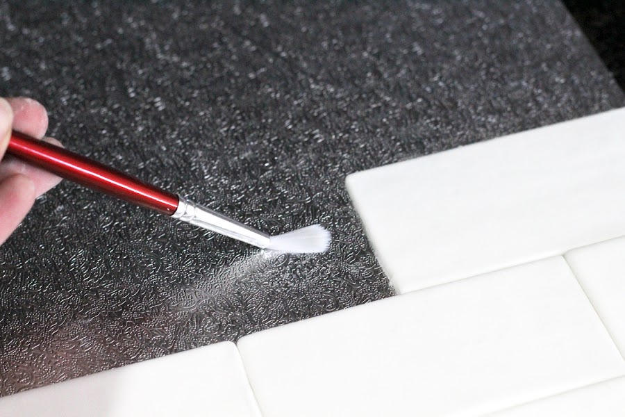 Con el pincel tamaño normal tirando a pequeño iremos mojando la base con el pegamento comestible e iremos adecuando a la base los ladrillos, uno a uno y en filas.
