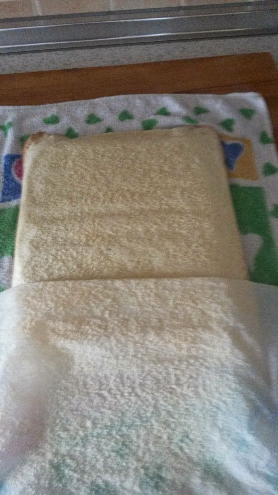 - Sacamos el bizcocho del horno y volcamos la bandeja sobre el paño, despegamos el papel de horno ( ¡Cuidadito que quema mucho!).