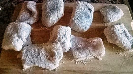 Corta la merluza en trocitos más pequeños ya que luego de rebozarla, crecen de tamaño. Sazónalas con pimienta y sal