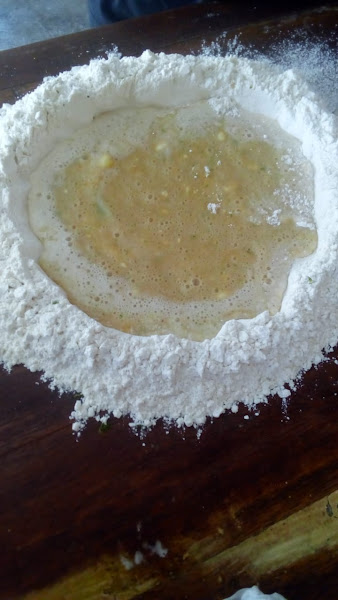 Forma una fuente con el harina y en el centro agrega el azúcar, la sal, los huevos, la vainilla, ralladura de naranja y la levadura fermentada. Empieza batiendo con las manos los ingredientes del centro y poco a poco vas incluyendo el harina.