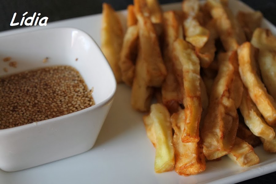 Otro rico aperitivo..........estos días las redes van llenas de recetas para estas fiestas, y yo os dejo estos bastoncitos de berenjena con una salsa de miel.