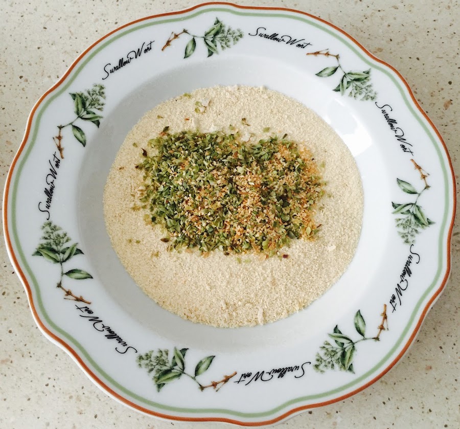 Lo primero que hay que hacer poner todas las especias dentro del pan rallado.