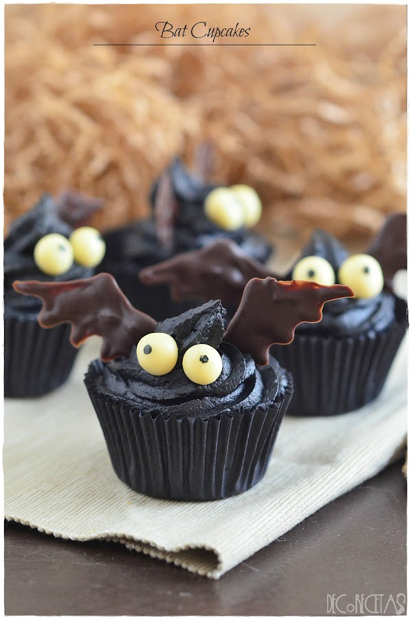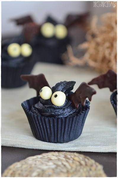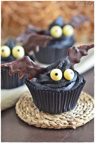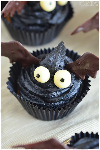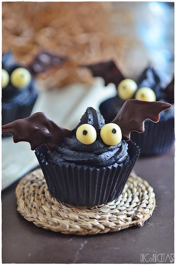 En un folio dibujo las alas de los murciélagos y dicho folio lo pongo debajo de un papel de horno y encima con chocolate fondant y mucho cuidado y paciencia voy haciendo la forma de las alas. Este papel lo meto al congelador hasta que está sólido y se desprende fácilmente el chocolate. Ya solo falta decorar con dos bolitas a las que he pintado la pupila en negro con un rotulador comestible y poner las alas