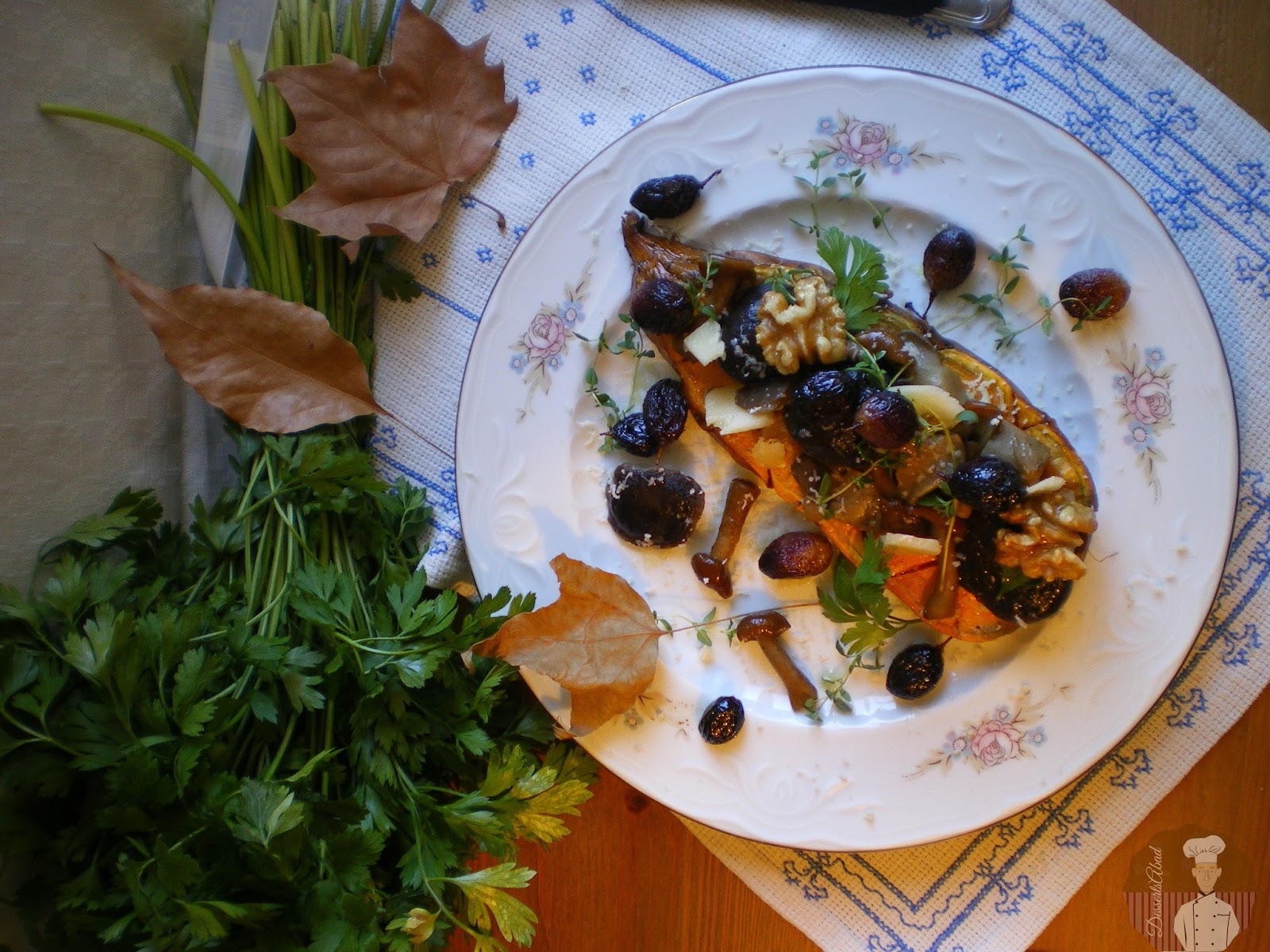 Una vez transcurrido el tiempo y las batatas estén en su punto, retiramos al plato donde vayamos a servir. Rallamos parmesano sobre cada batata, distribuimos unas cuantas setas por encima, añadimos unas cuantas lascas de queso para incrementar el sabor y por último, decoramos con el perejil, el tomillo y las nueces. Solo queda sentarse a la mesa y disfrutar del otoño servido delante de ti.