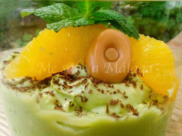 Crema de aguacates con caramelos Werther´s, naranja y virutas de chocolate negro.