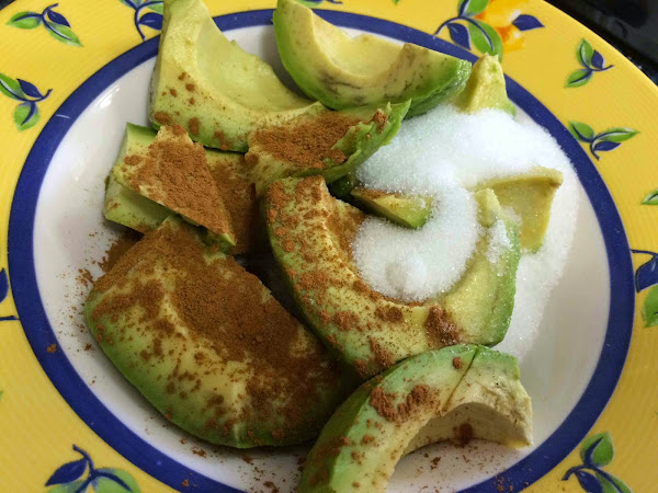 Abrimos los aguacates y los limpiamos. Añadimos el azúcar y la canela.