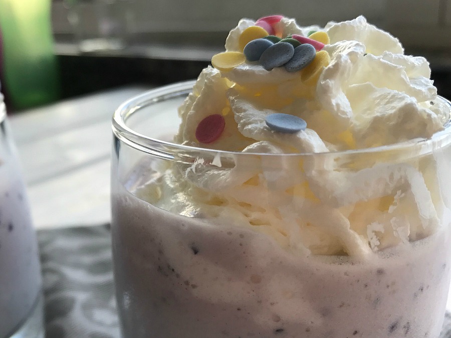 1. Ponemos el helado, la leche, los arándanos y la miel {si la ponemos} en el vaso de la batidora. Trituramos muy bien.