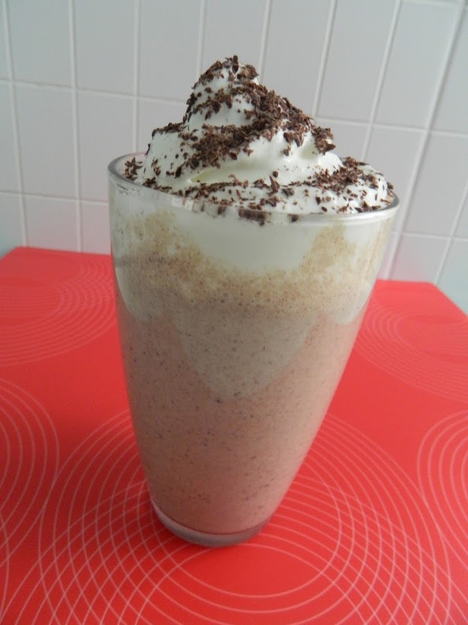 Para montarlo ponemos la mezcla en un vaso, la nata montada (crema de leche) encima, y sobre ella rallamos el chocolate.