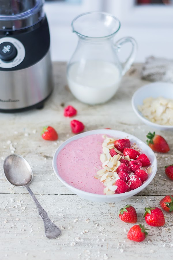 Así que esta receta está preparada completamente a su gusto, con leche de almendras, vainilla y toppin de almendras, fresas y frambuesas.