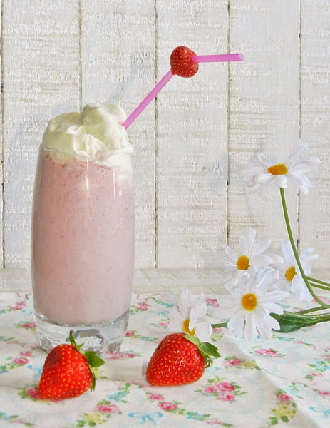 Montar la nata (crema de leche) con un par de cucharadas de azúcar y servir sobre el batido en un vaso alto.