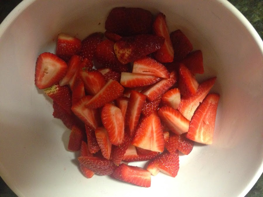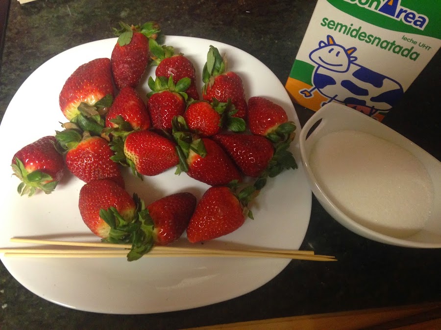Lavaremos las fresas, le cortaremos las hojas y trocearemos las fresas.