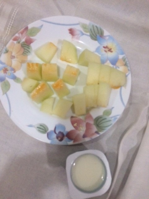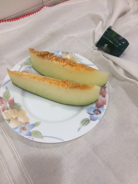 Limpio las rajas de melón y las troceo y listas al baso de la batidora,le añado 1/2 yogur y unas hojas de menta o hierva buena,lo bato todo y al vaso para beber.