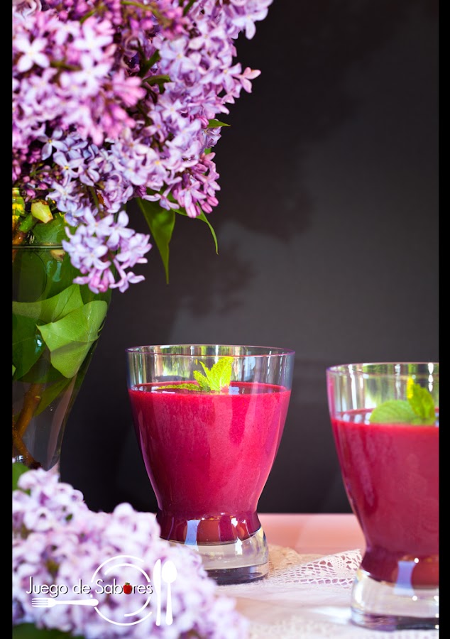 Tenemos amigos vegetarianos y veganos, o sea vegetarianos totales. Algunos nos han dicho que publicamos pocas recetas vegetarianas y tienen toda la razón del mundo. No somos un blog vegetariano ni vegano. Pensamos que ya hay buenos blogs especializados en este tipo de cocina o de filosofía de vida que excluye toda forma de explotación y crueldad para con los animales, y que nosotras poco podríamos aportar. Pese a ello hoy hemos elaborado un sencillo batido a base de moras, arándanos, frambuesas, fresas, plátano, bebida de arroz y azúcar panela que podrían tomar sin problema nuestros amigos. Va por ellos.