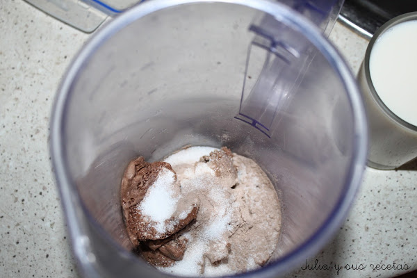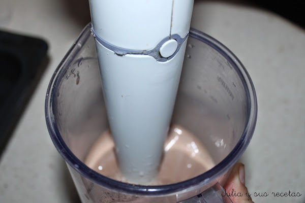Ponemos todos los ingredientes en un recipiente profundo. Yo lo hice en el vaso de la batidora porque era solo para dos personas.