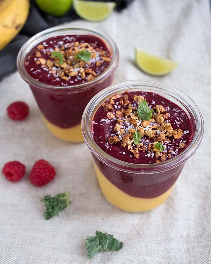 Ya veis que son muy sencillos y se preparan en menos de 5 minutos pero no se me había ocurrido antes juntarlos en un solo vaso. El de mango es el más dulzón y se compensa con el de frambuesa que tiene un toque más ácido, así que juntos hacen el batido perfecto. Para acabar no os olvidéis de darle un toque crujiente con un poco de granola casera por encima, cualquiera de estas granolas os encantará: