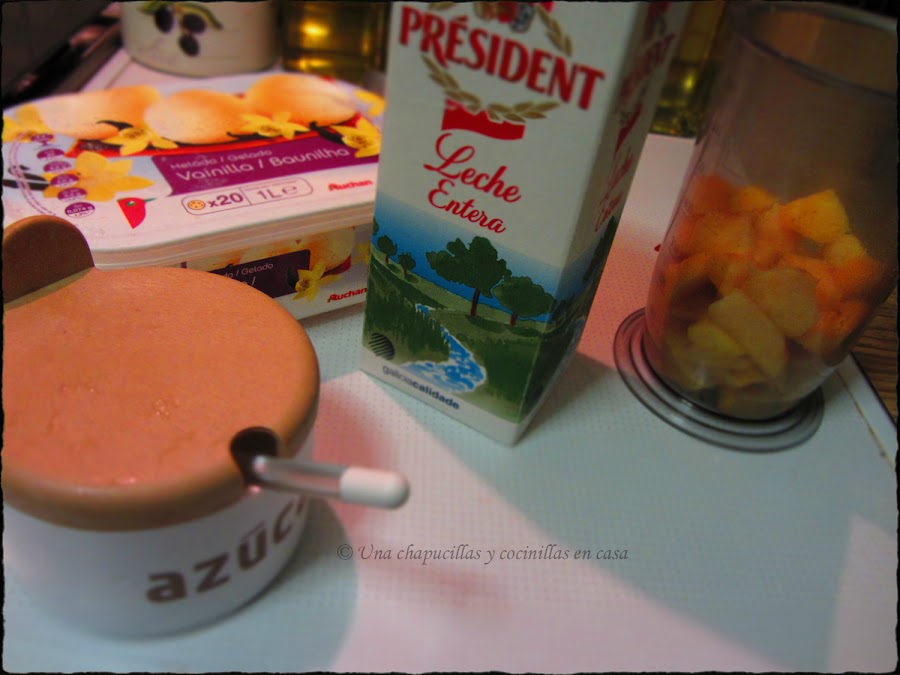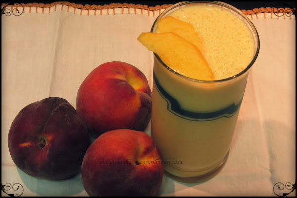 Ahora que ya va llegando por fin el buen tiempo y temperaturas mas agradables, apetece tomarse un batido fresquito, yo he hecho este de melocotón pero se puede cambiar perfectamente por fresas por ejemplo que ahora están de temporada y cambiar el helado de vainilla por nata (crema de leche).