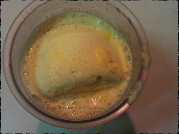 Mezclarlo bien con la batidora. Incorporar un par de bolas de helado de vainilla y batir de nuevo.
