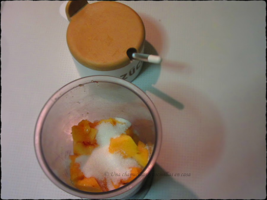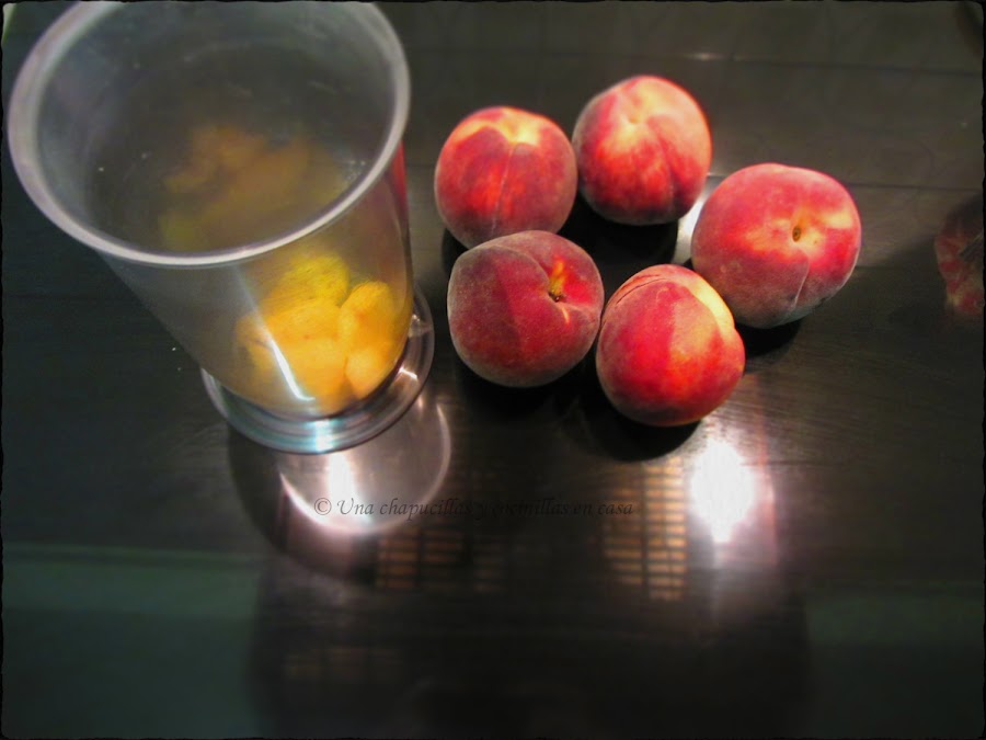 Pelar y trocear los melocotones y ponerlos en un vaso de batidora. Echar azúcar al gusto.