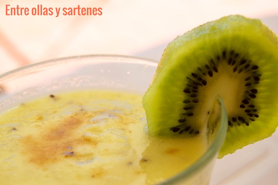 Agregamos la manzana y el kiwi troceados, así como el yogur y el azúcar moreno.