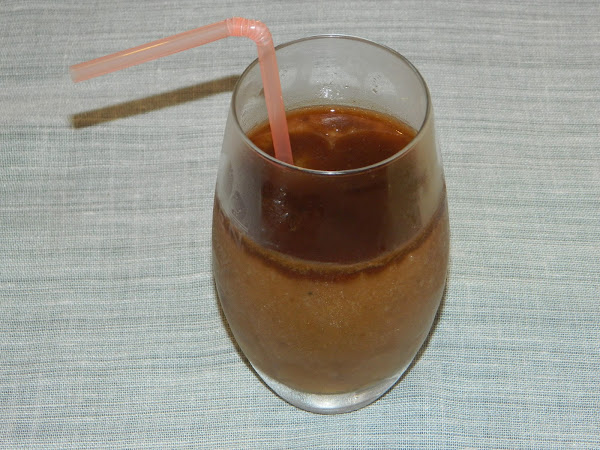 1 plátano, 100 ml. de leche, 50 ml. de café y 10 ml. de caramelo liquido