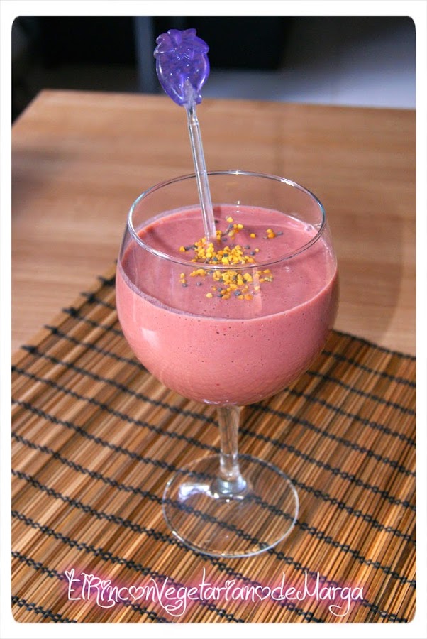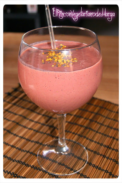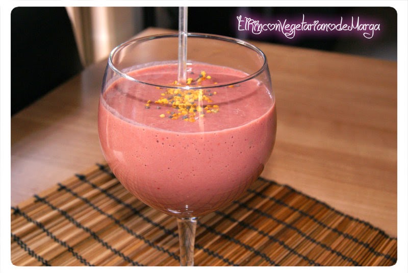 Feliz domingo a todxs!! Hoy os traigo un batido delicioso, con sabor a chocolate pero sin llevarlo. Para asegurar mi aporte proteico de vez en cuando, unas 2 veces por semana, me hago un batido de fruta y le añado unas cucharadas de proteína de guisante en polvo. Son naturales, de herbolario y hay de muchos sabores. Esta vez la compré de chocolate. Si no queréis poner la proteína lo podéis hacer con cacao en polvo normal. Ingredientes: 100 gr. de fresas 50gr. de bebida de soja 1 cucharada rasa de vegelyxir de chocolate Sirope de ágave para endulzar Procedimiento: Lavamos y quitamos la parte verde de las fresas, las partimos por la mitad y las introducimos en la licuadora, añadimos la bebida de soja y la cucharada de endulzante. Licuamos bien hasta que no queden grumos.