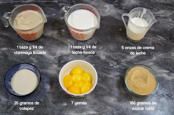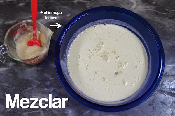 Tenía una chirimoya en mi casa y como los últimos días han estado soleados, me provocó hacer un postre frío. Este bavarois es distinto al de fresas que preparé antes ya que no lleva claras, sino, una custard de base. La receta original la encontré en un coleccionable de El Comercio pero he cambiado las variedades, modificado el proceso y también le agregué la salsa de naranja. Yo lo deje en la refrigeradora solo por 2 horas y estaba perfectamente cuajado. Pueden utilizar moldes de silicona individuales, o un molde de silicona grande.