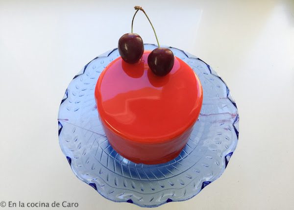Cuando nuestro glaseado alcance los 32º preparamos una rejilla sobre una bandeja para poder recoger el sobrante de cobertura, colocamos la tarta que estará super congelada y glaseamos con una buena cantidad, ya que nos e puede rectificar, se comienza del centro para afuera haciendo una espiral y desde una altura considerable, eso hace mas estable el chorro.