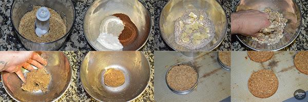 Al día siguiente, rallamos el streussel con un rallador grueso y lo ponemos en aros de 8 cm de diámetro. Horneamos a 150ºC durante 15 minutos.