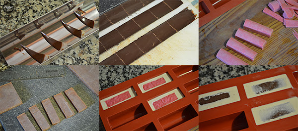 Para hacer las piezas de la parte superior, recortamos hojas de papel de acetato con la forma deseada, las cubrimos con chocolate atemperado y las ponemos sobre un molde de media caña para conseguir la forma ligeramente curvada. Dejamos secar completamente.