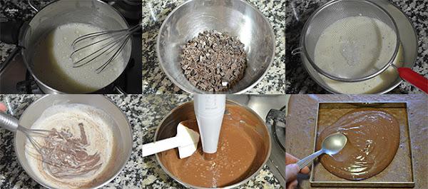 Retiramos del fuego y vertemos sobre el chocolate (previamente troceado), al mismo tiempo que lo vertemos lo vamos colando. Removemos y mezclamos bien con las varillas hasta que el chocolate se funda completamente.