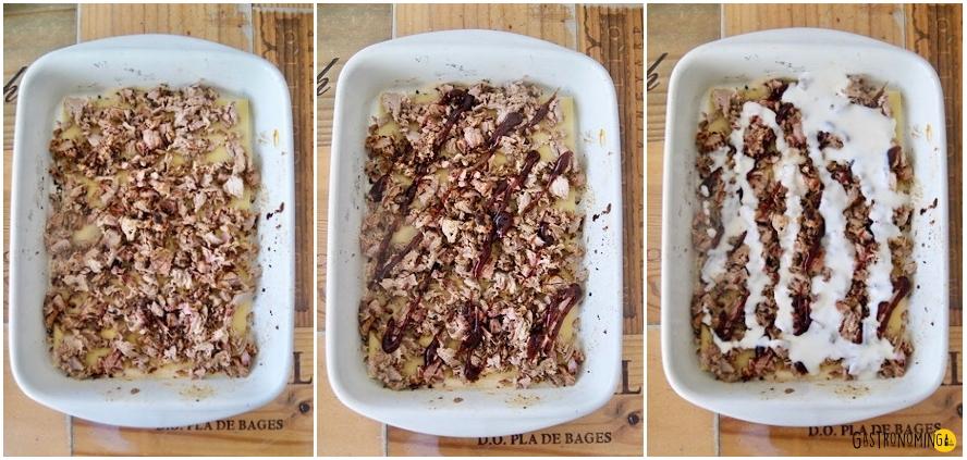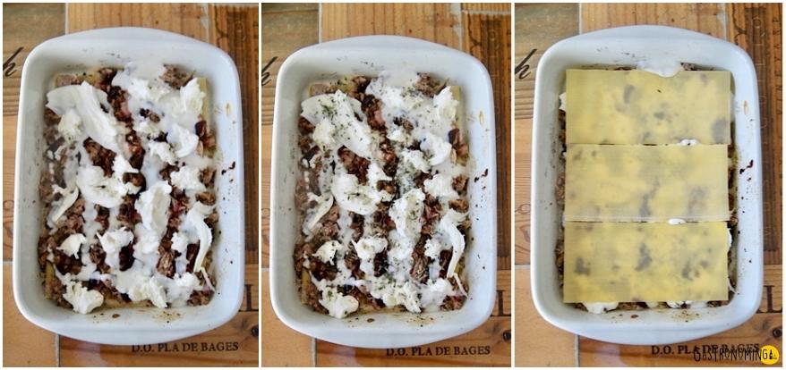 1. Teniendo todos los ingredientes listos (no te voy a explicar como se hace una salsa bechamel, verdad?) pues lo dicho, ahora solo toca montar. Pre calentamos el horno a 200ºC.2. Una pequeña base de bechamel y empezaremos, pasta de lasaña, carne de pulled pork, salsa bbq (tampoco te pases aquí), más bechamel, queso mozzrella y una pizca de orégano, y así vamos montando hasta acabar los ingredientes.
