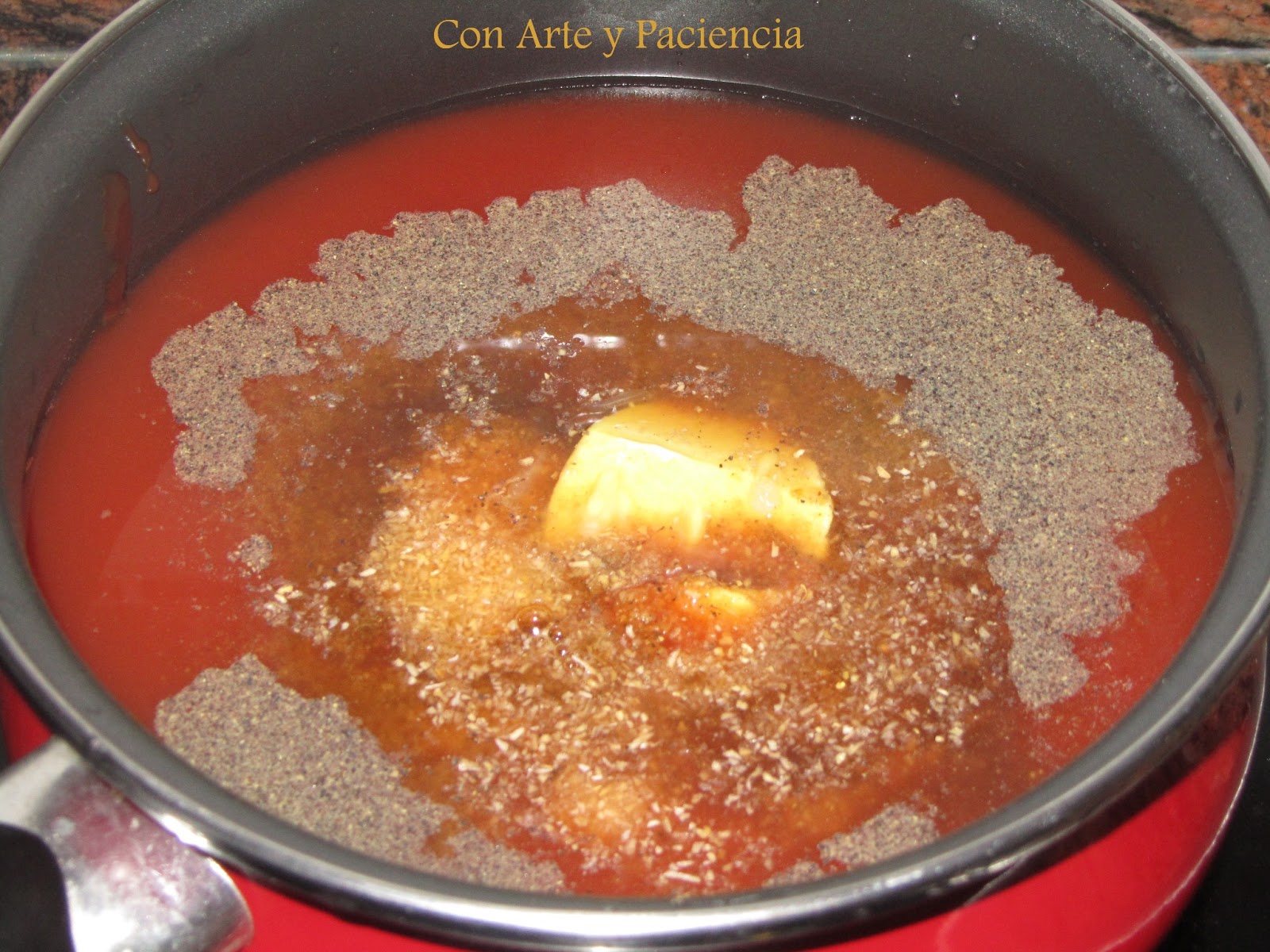 En una olla mezclamos todos los ingredientes. Llevamos a ebullición unos 5 minutos y bajamos a fuego medio-bajo durante 40 minutos removiendo con frecuencia sin tapar para que reduzca.