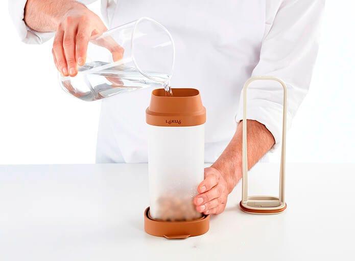 1. Introduce los ingredientes y el agua en el recipiente hasta la marca y déjalos en remojo durante 12 horas.