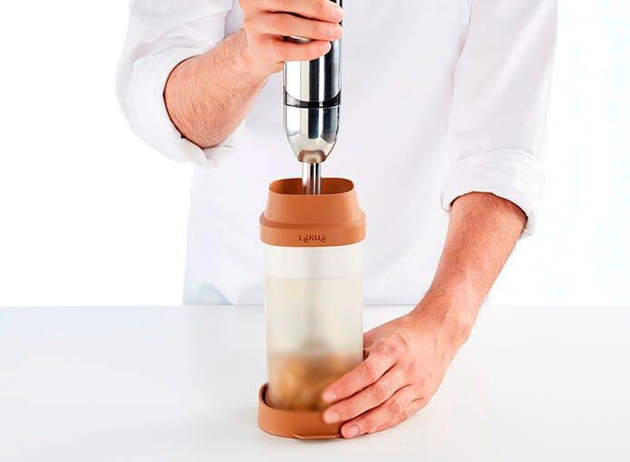 Incluye vaso contenedor colapsale para mantener los ingredientes secos