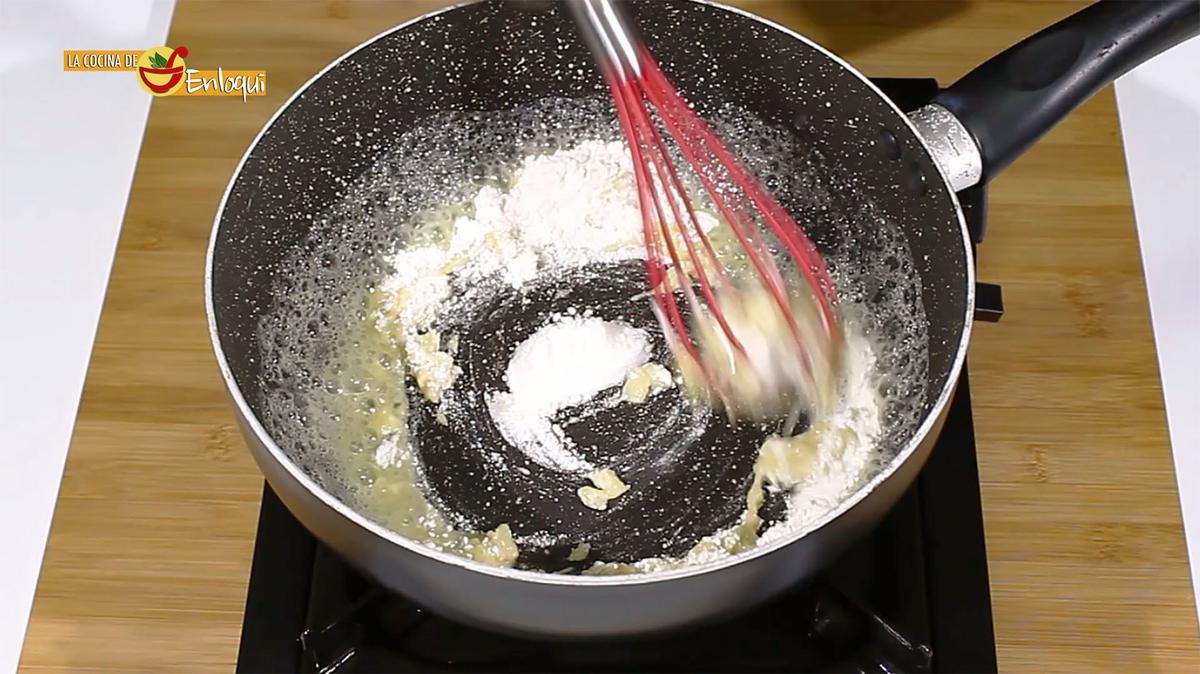 Cuando esté fundida añade la harina y remueve con la ayuda de unas varillas manuales. Debes tostar la harina para que la bechamel no tenga después ese desagradable sabor a harina cruda.