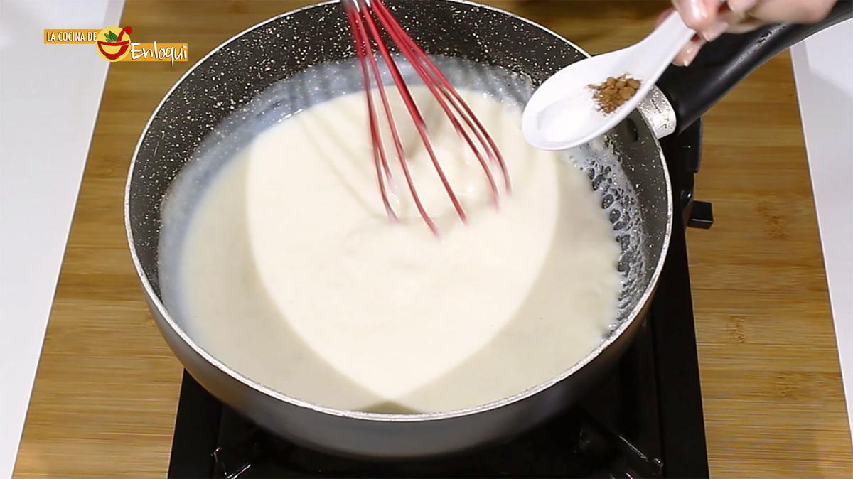 A continuación pon un poco de sal y una pizca de nuez moscada que le aportará el sabor característico de la bechamel.