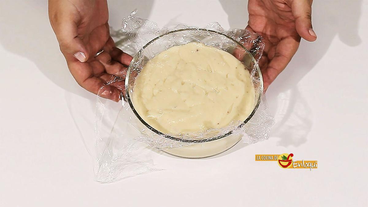 Ahora pasa la bechamel a un recipiente donde pueda enfriar. Te recomiendo cubrir con film transparente. Coloca por encima de forma que el film quede en contacto con la salsa. Así, al enfriar, no creará esa desagradable costra en la capa superior.