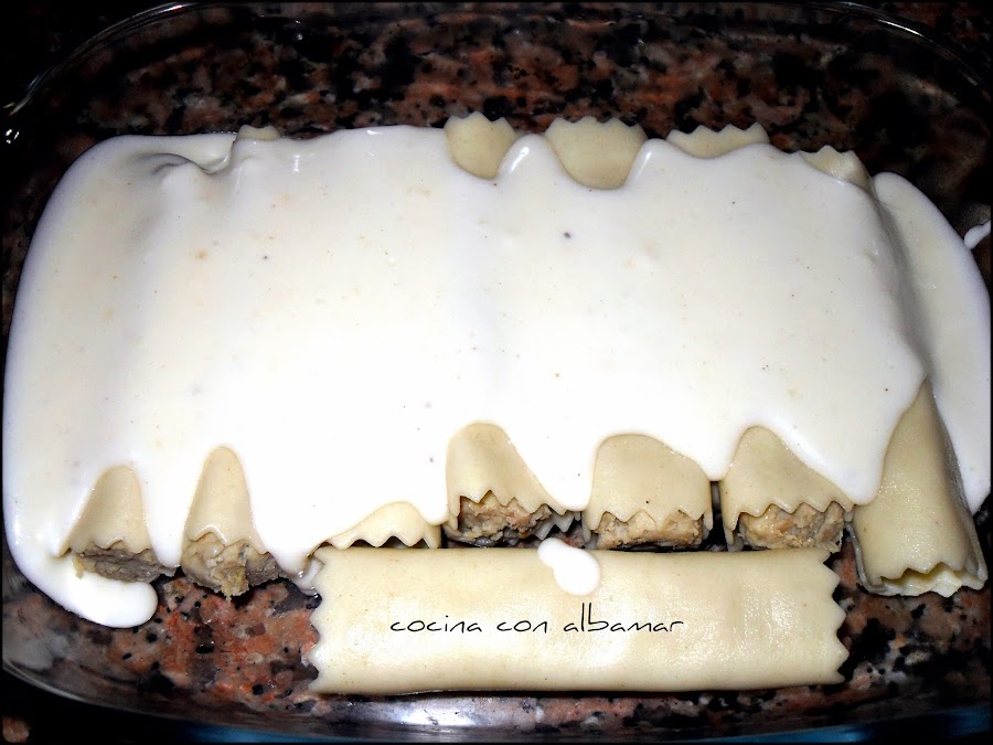 Verter la bechamel sobre los canalones y esparcirla bien cubriéndolos por completo.