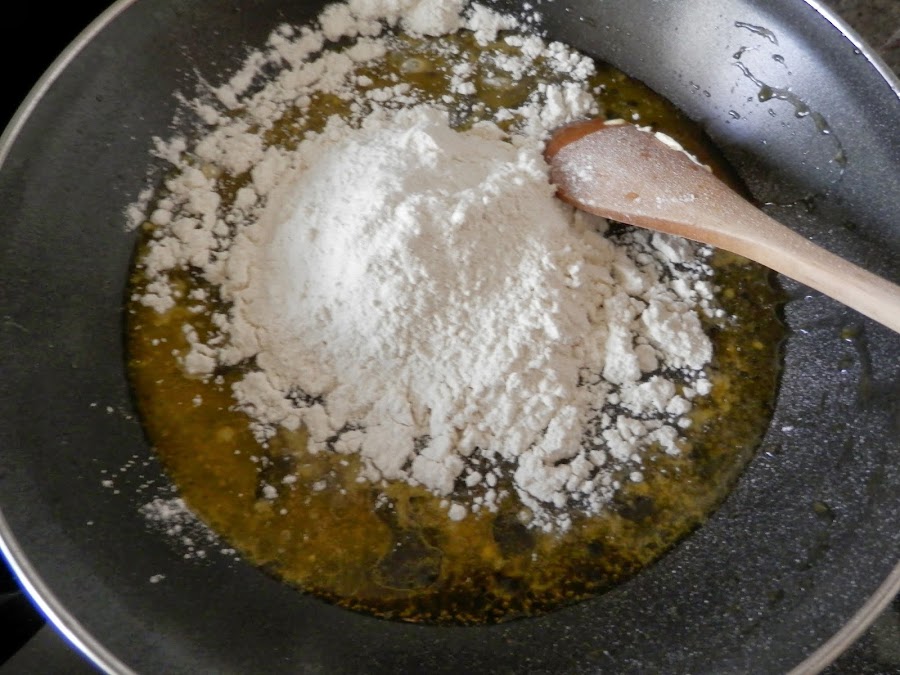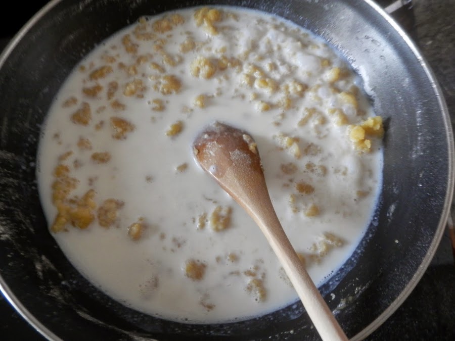 Calentamos la leche y la vamos añadiendo poco a poco a la mezcla de harina y margarina.