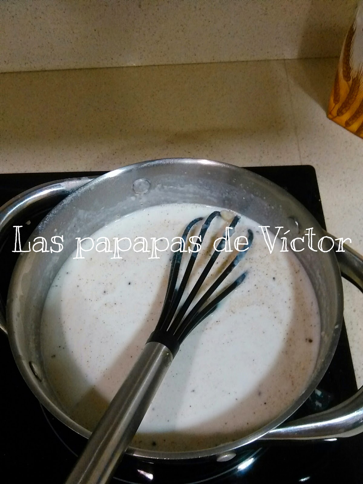 Echo esto se va añadiendo poco a poco la leche a la que se incorpora la sal, la pimienta molida y un poco de nuez moscada, a mi me gusta echar las dos especies.