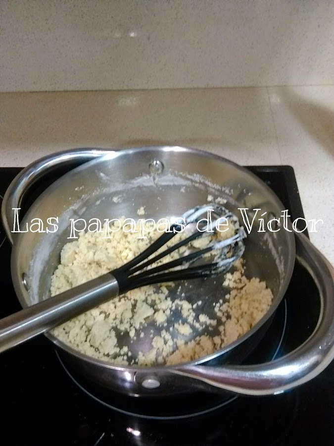 Poner la margarina en la cazuela y a continuación la harina de golpe e ir removiendo se hará una pelota que parece que no se separa nunca, pero... TRANQUILOS QUE : N O P A S A N A D A !