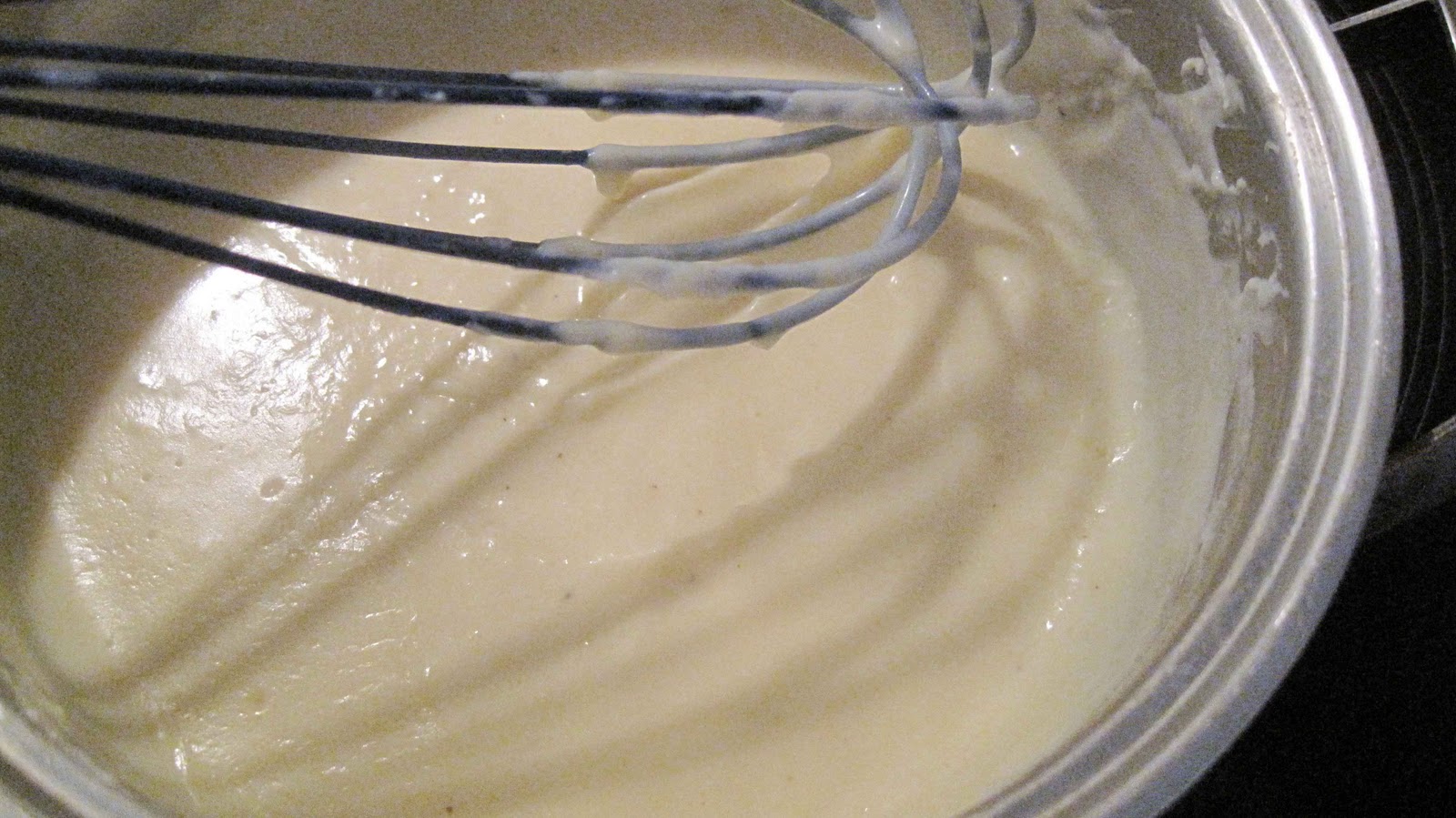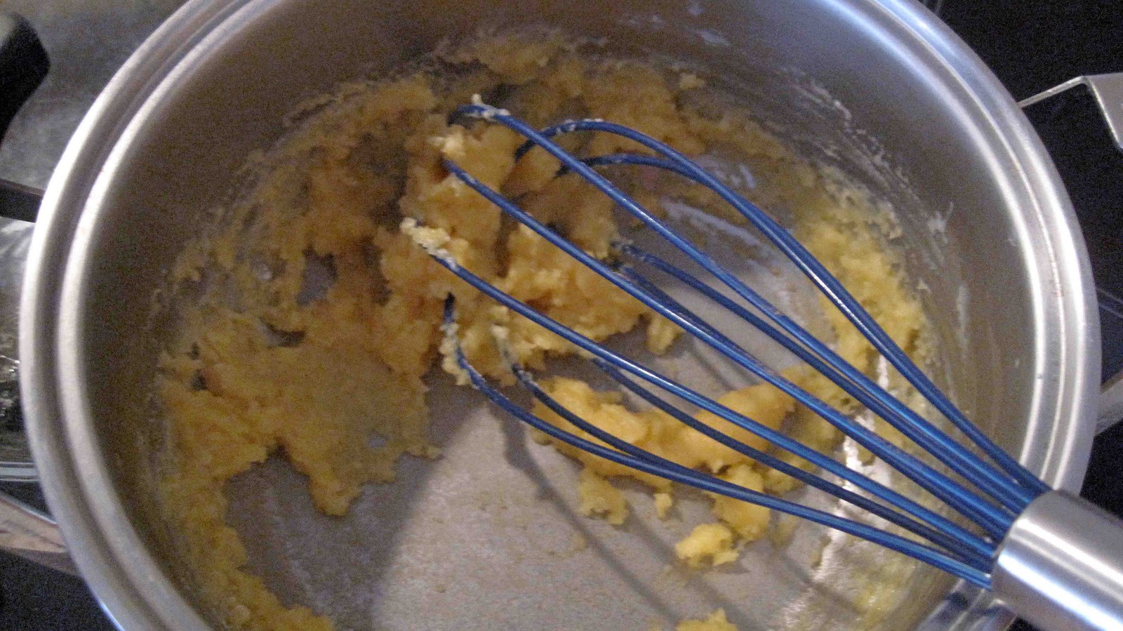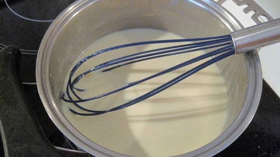 Retiramos del fuego y le añadimos la leche, si poner en el fuego movemos bien hasta que veamos que se ha disuelto la harina.
