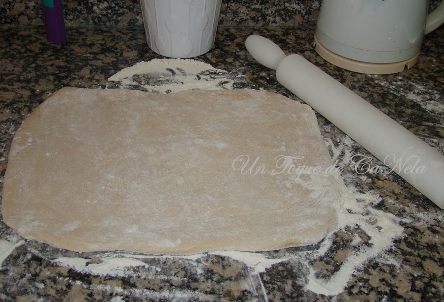 Cuando la masa esté lista, espolvorear, generosamente con harina, la superficie de trabajo, poner la masa y echarle un poco de harina para que el rodillo no se pegue.