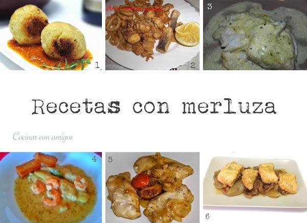 Desde mi blog os traigo estas albóndigas de merluza y gambas (1) hechas al horno, sanas y deliciosas. Elvira de Así se come en Granada nos trae un pescaito frito (2) que entre otros incluye cortadas de merluza. Y Fran del blog Que rico! nos enseña a cocinar la ventresca de merluza con tomateros (5), una parte muy jugosa y sabrosa de este pescado.