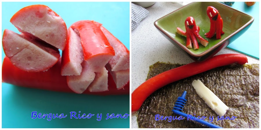 5. Por último tenemos un pulpito, hecho de salchicha de frankfurt. Yo las elegí rojas por añadir color al cuadro. Cocinamos la salchicha durante 30-40 segundos en el microondas. Cortamos las 2 puntas en 2 trozos de unos 3-4 cm. Cortamos cada trozo por la mitad dejando los últimos 1,5 cm. de la punta sin cortar. Cada mitad la cortamos en 3 partes que al abrirse serán las patas. Los ojos son tiritas de queso y la boca es una esquina de hoja de alga nori para sushi.